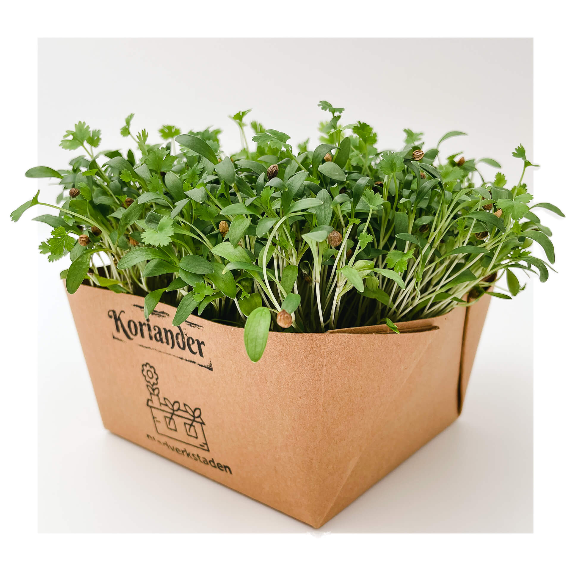 Vår klart mest populära sort av mikrogrönt. Vår korianderskott är ca 8 cm höga och kan komma med 2 eller 4 blad som växer utifrån en klart lime-grön stam. Majoriteten av frökapslarna sitter kvar vilket ger extra smak och textur.